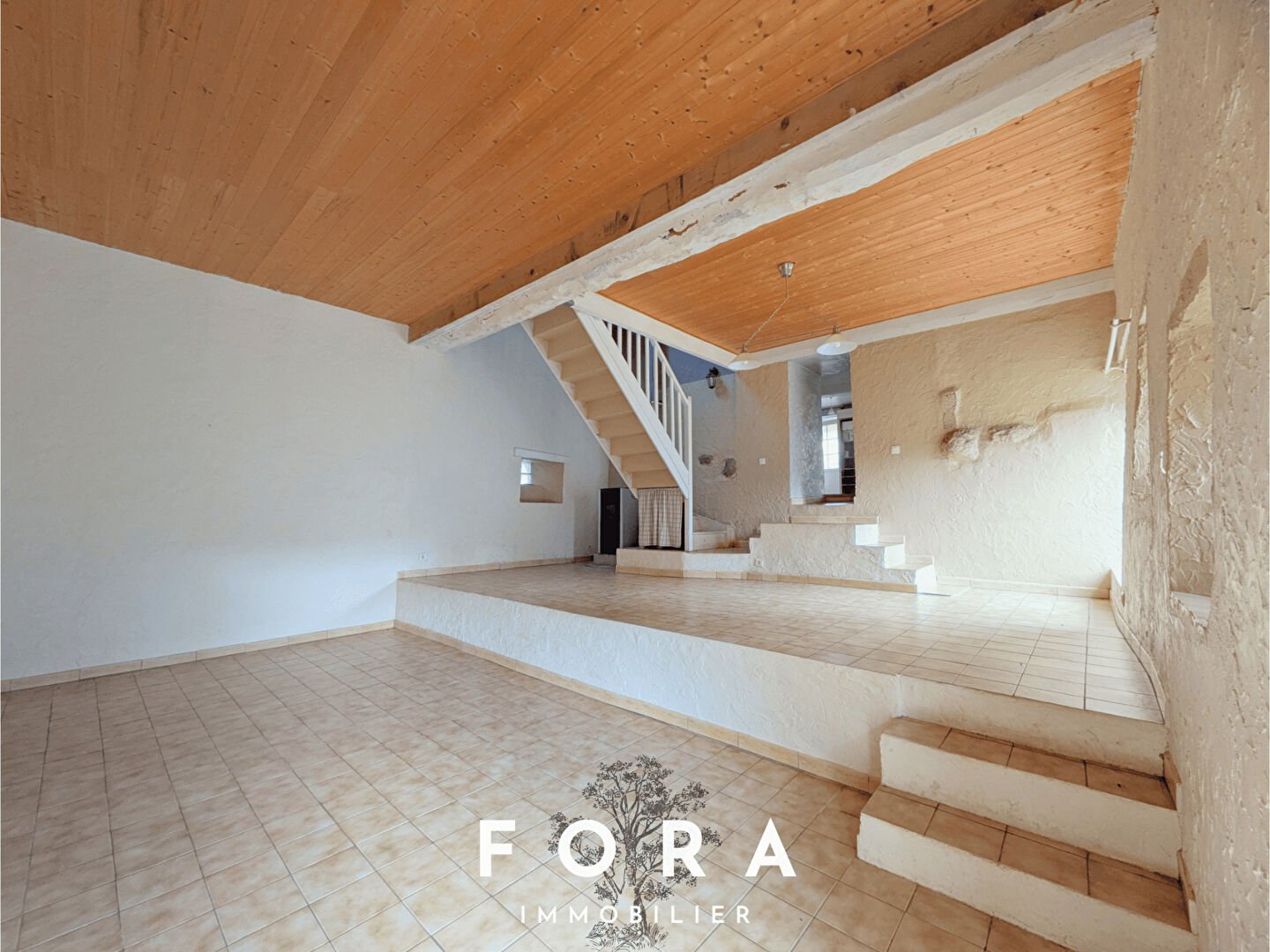 Elle dispose d’une entrée avec cuisine aménagée, d’un séjour lumineux d’environ 38 m² avec poutres apparentes et poêle à granulés. Toujours au rez-de-chaussée, vous trouverez une salle d’eau avec WC.