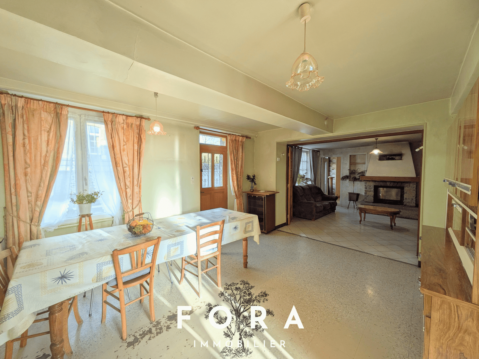 Au rez-de-chaussée, vous trouverez un salon avec cheminée à foyer ouvert, une salle à manger avec insert bois, ainsi qu’une grande cuisine de 18 m² avec arrière-cuisine donnant accès à l’extérieur. Une salle d’eau complète ce niveau.