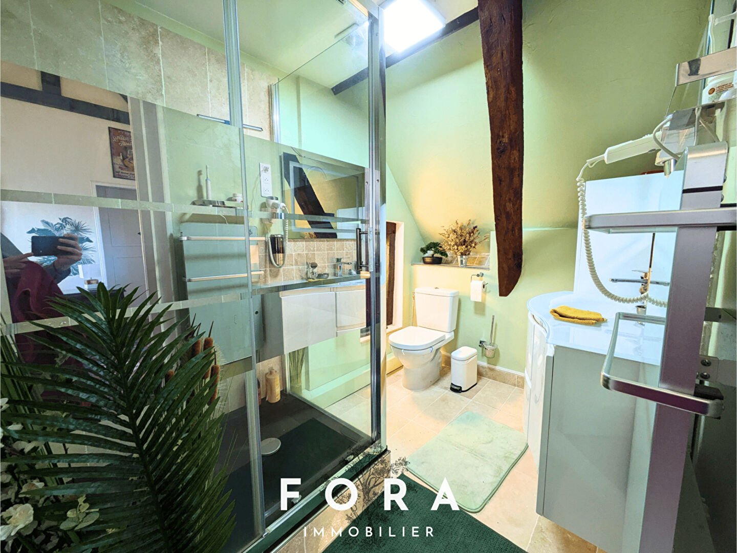 On the main level, you’ll find a cozy 33 m² living room with a wood stove, opening onto a fully fitted and equipped kitchen, a bright 25 m² dining room, a first bedroom, and a large 22 m² master suite with a private shower room. Upstairs, there’s another bedroom with its own shower room and a room currently used as a music studio, completing the guest area.